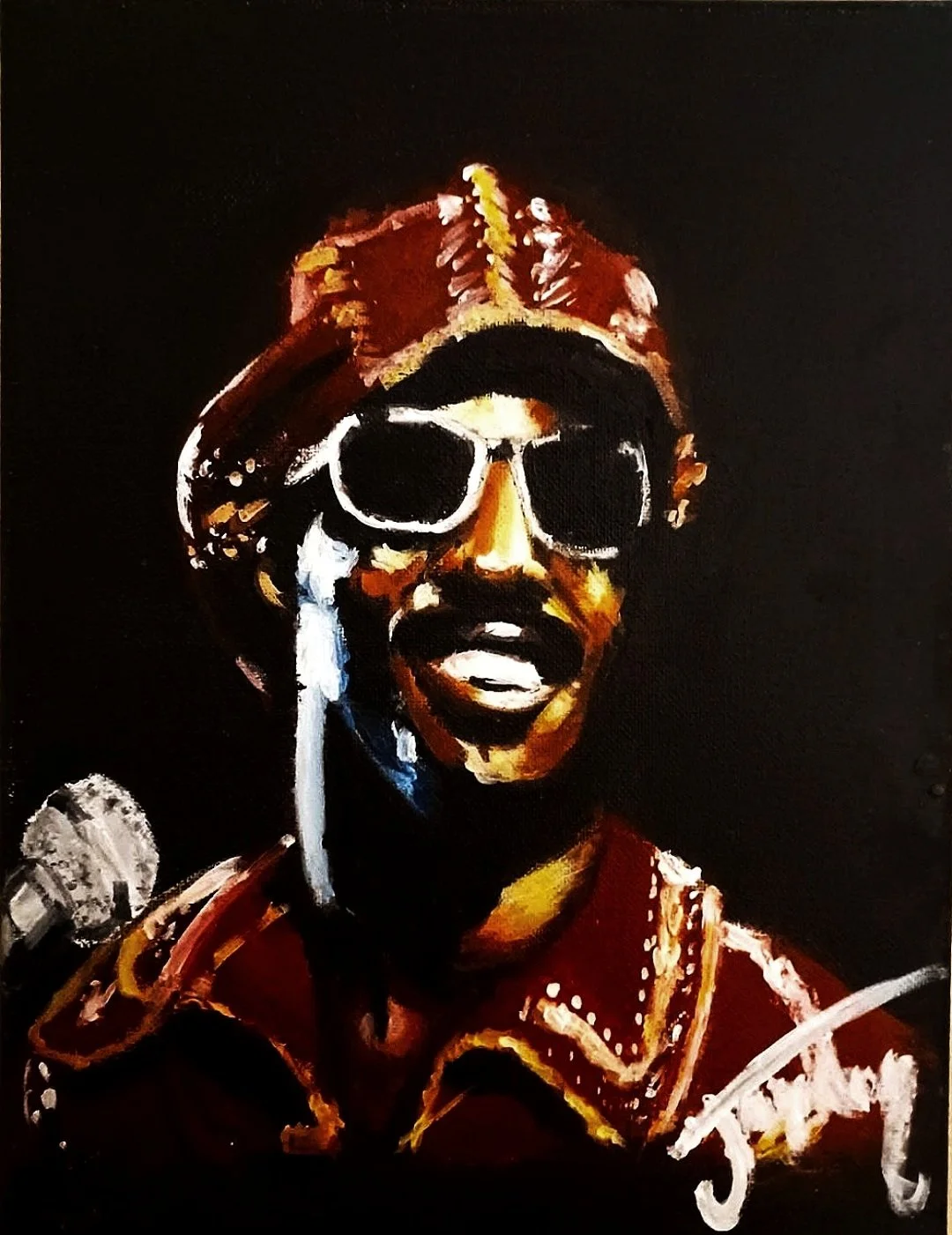 Values. This acrylic painting depicts the musical icon, Stevie Wonder, in the midst of his artistry while wearing luxurious garments. What is immediately apparent from a technical side is the unapologetic usage of intense dark tones, vibrant mid tones and bright highlights to fully bring Stevie to life. However, the piece's title holds a deeper meaning. Does Stevie value the pure expression of his talent or does he instead value more the lavish luxuries his talents allow him to obtain. This question should be at the front of every creator's mind or else fate will decide the answer for you.